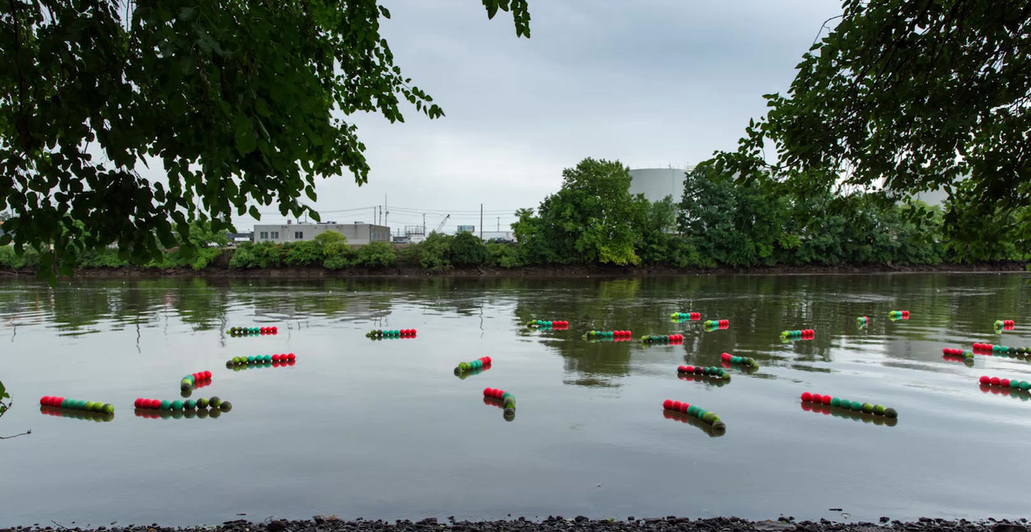 Hundreds of round, brightly-painted buoys register the Schuylkill River’s twice-daily changes tide, drawing attention to what many Philadelphians overlook: that they live within the daily influence of the ocean and its tides. Tide Field creates a visual reminder of that cycle, providing neighbors and visitors alike a chance to notice how the river changes throughout the day. Tethered in clusters along the shoreline of Philadelphia’s Bartram’s Garden, the famed public botanical garden situated on the banks of the Schuylkill, the installation literally changes with the tide. When the tide is high, only a few buoys are visible; as the tide lowers, more buoys are exposed. These changes are easy to see from Tide Field’s partner installation, River Rooms, a series of six boat-shaped viewing platforms placed throughout Bartram’s grounds. Together, Tide Field and River Rooms create not only an invitation to be aware of the tide’s constant rhythms but also accessible spaces for reflection and observation of the tide’s watery clocks.